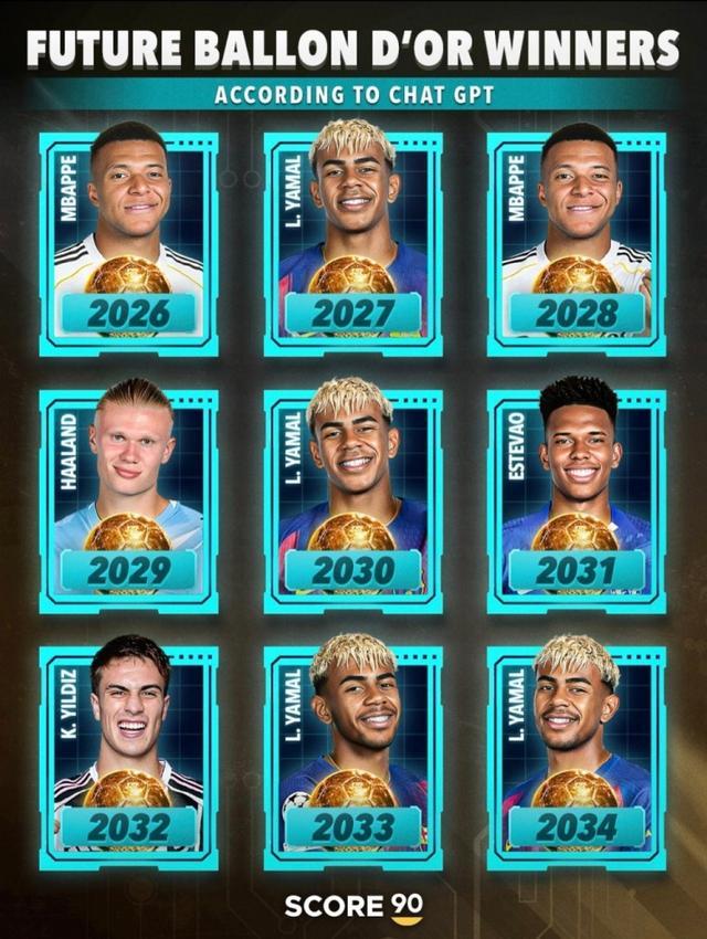 9月24日讯 Score90列出ChatGPT对未来几年金球奖获奖者名单,其中9年中亚马尔占4席,具体如下: