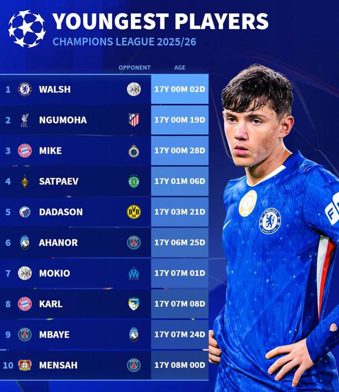 1. 雷吉-沃尔什(切尔西) 17岁2天(vs阿贾克斯)