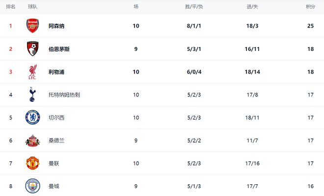 在积分榜上,阿森纳是独一档的存在,拿到25分排名榜首。伯恩茅斯这匹黑马以18分排第2。利物浦赢球之后,总积分也是达到18分,排名升到第3。热刺、切尔西、桑德兰和曼联这4支球队积分相同,都是17个积分。曼城踢了9轮,只拿到16分,排名第8。