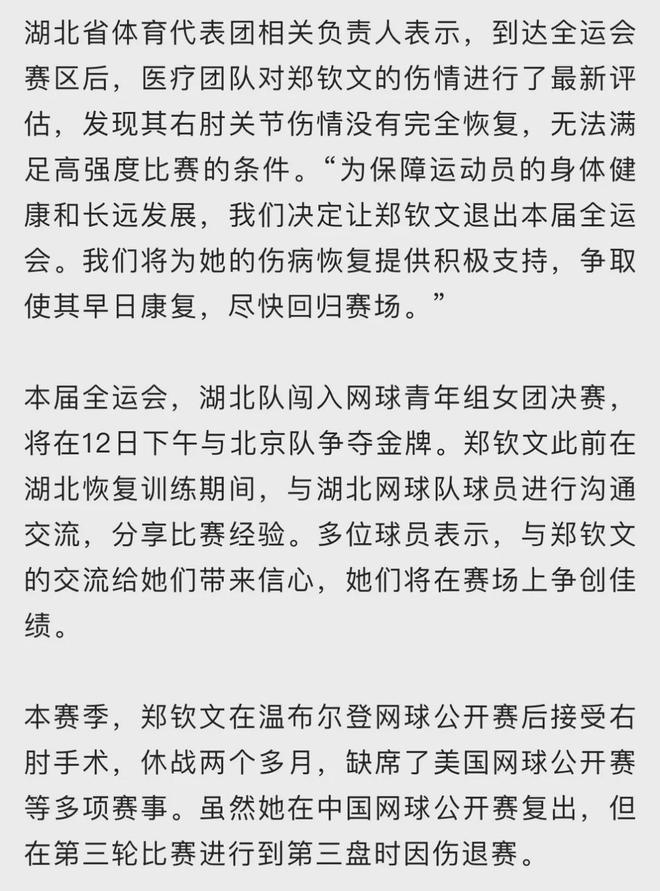 - 体育战报 | 郑钦文,退出第十五届全运会