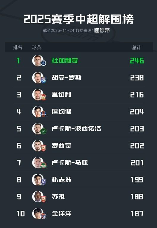11月22日,2025赛季中超联赛落下战幕。根据懂球帝统计的2025赛季中超球员解围榜:深圳新鹏城后卫杜加利奇246次排名第一,天津津门虎后卫胡安-罗斯和青岛西海岸后卫里切利分列二、三位。
