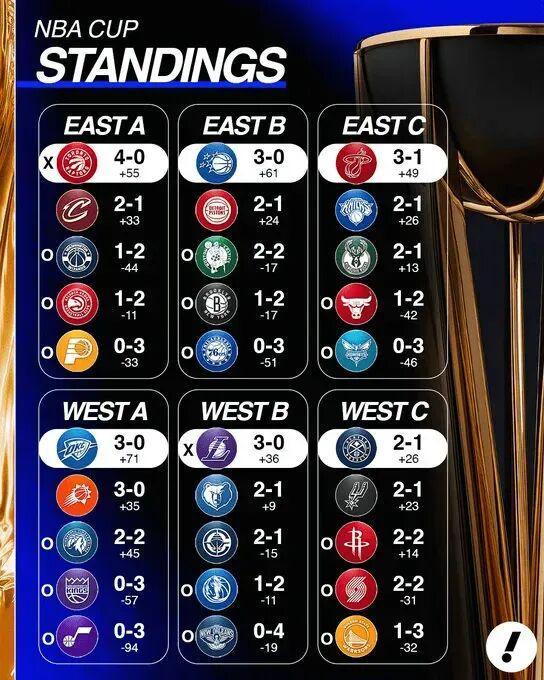 今天是美国感恩节,NBA没有安排比赛。我们今天聊聊NBA杯季中赛先给你们看看NBA杯的小组最新战绩排名情况