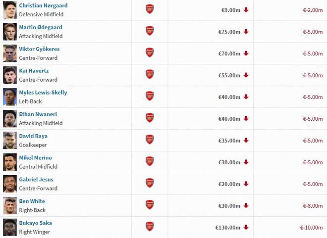 - 英超 | 阿森纳球员身价变动:萨利巴上涨1000万欧,萨卡下跌1000万欧