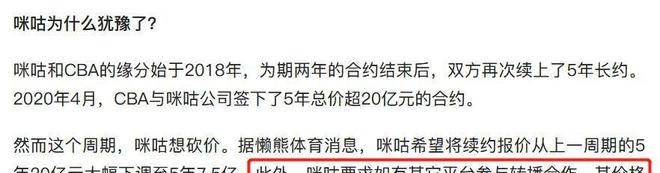 因此当旧约临近到期,咪咕提出重新议价。他们希望CBA也能参照中超标准,将未来五年的总报价调整为7.5亿元。同时附加一项条款:若其他平台参与竞标,其出价不得低于咪咕报价。