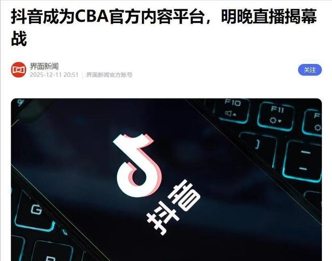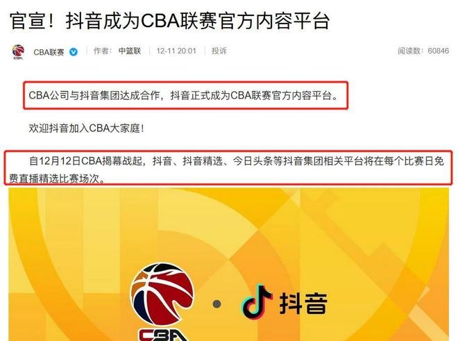 它正是国民级短视频平台——抖音。12月11日晚8点,CBA官方发布公告,宣布与抖音集团达成战略合作。自12月12日揭幕战起,抖音及其旗下平台如今日头条、西瓜视频等;将在每个比赛日免费提供精选场次的高清直播服务。