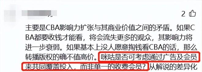 更有网友建议,咪咕不妨借此契机转型商业模式;尝试结合广告收入与会员订阅双轨并行,而非依赖单一收费来源。关于CBA转播权之争,抖音作为新势力的登场;对咪咕构成挑战的同时,也孕育着变革机遇。最终是危机还是转机,取决于咪咕接下来的战略抉择。结语12月12日晚7点35分,新赛季首战准时开哨。你会选择哪个平台收看这场比赛呢?免责声明:文章描述过程、图片都来源于网络,此文章旨在倡导社会正能量,无低俗等不良引导。如涉及版权或者人物侵权问题,请及时联系我们,我们将第一时间删除内容!如有事件存疑部分,联系后即刻删除或作出更改。本文内容信息来源:【CBA联赛个人主页】【界面新闻】