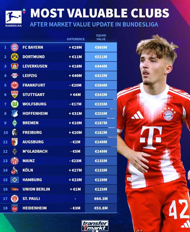 - 德甲 | 德甲俱乐部身价榜:拜仁9.8亿欧断档领先,海登海姆5380万最低